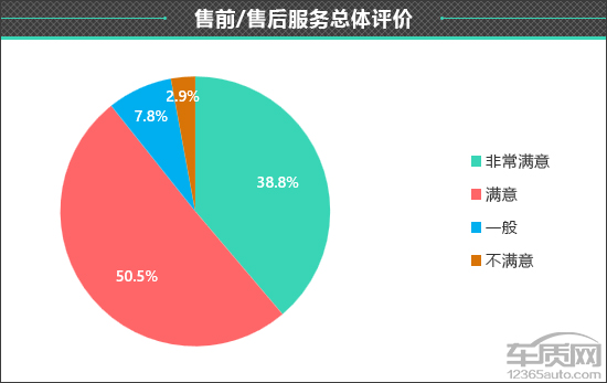 不过,在售前/售后服务总体评价中,接受调查的车主还是给出了相对客观的评价,其中认为“非常满意”的车主占比为38.8%,认为“满意”的车主占比为50.5%,认为“一般”的车主占比为7.8%,仅2.9%的车主表示“不满意”。