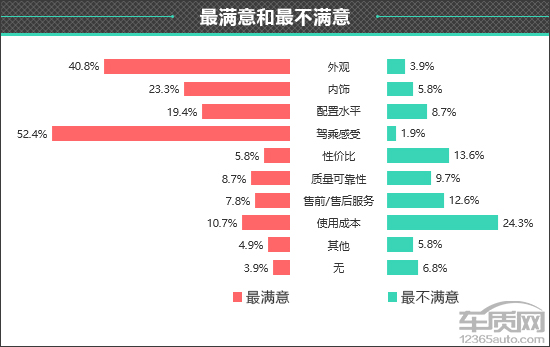 在衡量一款车型驾乘感受如何时,每个人所看重的部分不尽相同。在此次调查中,有63.1%的车主表示更看重“乘坐感受”。另外还有21.4%和15.5%的车主分别看重“驾驶和乘坐感受兼顾”和“驾驶感受”。
