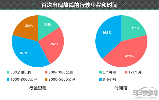 在这些出现非人为故障的车辆中,首次故障出现在行驶里程在1000-3000公里的占比最高,为36.8%;行驶里程在500-1000公里出现故障的车辆占比其次,为26.3%。而对于首次出现故障时间段的调查结果显示,对于大多数受访车主而言,车辆首次故障均出现在购车1-3个月,占比为42.1%。