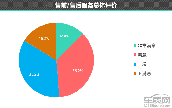 在售前/售后服务总体评价中,接受调查的车主还是给出了客观中肯的评价,其中认为“非常满意”的车主占比为12.4%;认为“满意”的车主占比为36.2%;认为“一般”的车主占比为35.2%,还有16.2%的车主明确表示“不满意”。