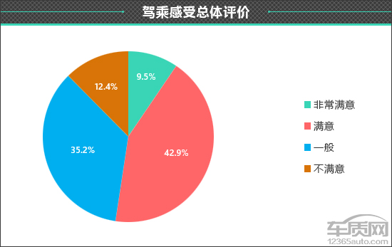 在2025款吉利银河星舰7 EM-i驾乘感受的综合评价中,认为“满意”的车主占比最高,达到了42.9%;给出“非常满意”评价的车主占比为9.5%;认为“一般”的车主占比为35.2%;另有12.4%的受访车主明确表示“不满意”。