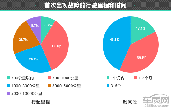 在这些出现非人为故障的车辆中,首次故障出现在行驶里程在500-1000公里的占比最高,为34.8%;行驶里程在1000-3000公里出现故障的车辆占比其次,为26.1%。而对于首次出现故障时间段的调查结果显示,车辆首次故障出现在购车3-6个月的占比最高,达到43.5%。