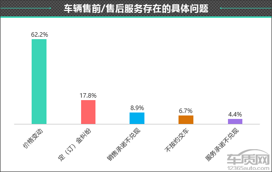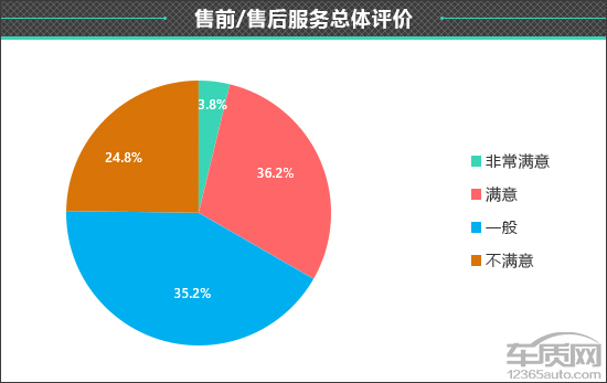 在售前/售后服务总体评价中,接受调查的车主还是给出了客观中肯的评价,其中认为“非常满意”的车主占比为3.8%;认为“满意”的车主占比为36.2%;认为“一般”的车主占比为35.2%,还有24.8%的车主明确表示“不满意”。