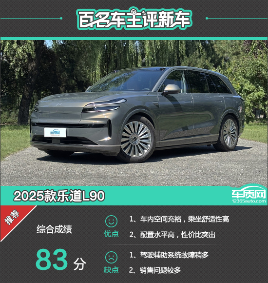 在收集到的103份有效问卷中,根据车主对2025款乐道L90在车型基本面、驾乘感受、使用成本以及质量可靠性、售前/售后服务方面给出的真实评价,在此次调查中2025款乐道L90的综合得分为83分,达到了车质网的推荐标准。