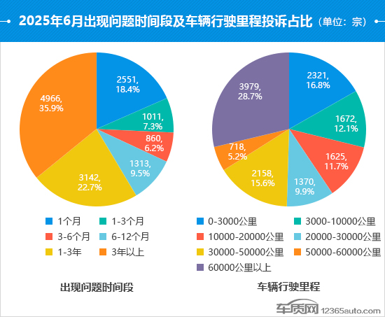 6月,行驶里程在10000公里以内的投诉占比延续了上个月的下降趋势,较5月份降低了3.6个百分点,再创年内新低。相比之下,行驶里程60000公里以上的投诉占比开始逐月提升,已接近总量的三成。