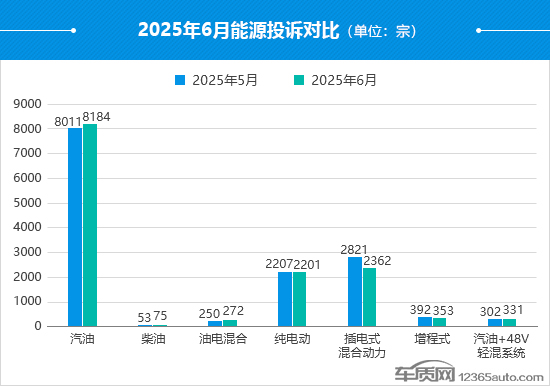 从6月份能源投诉对比来看,汽油车型依旧占据大多数份额,投诉量环比微增0.4%。同期,插电式混合动力车型的投诉量出现明显回落,较5月份下降16.3%,整体口碑表现有所好转。
