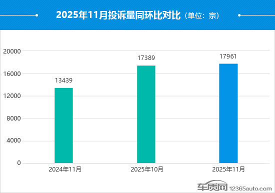 据国内领先的缺陷汽车产品信息收集和汽车消费者投诉信息受理平台车质网统计,2025年11月共受理车主有效投诉信息17,961宗(其中含第三方平台和后装轮胎投诉共43宗),环比上涨3.3%,同比上涨33.6%。今年1-11月累计投诉量创纪录地突破20万宗,较去年同期上涨32.3%。