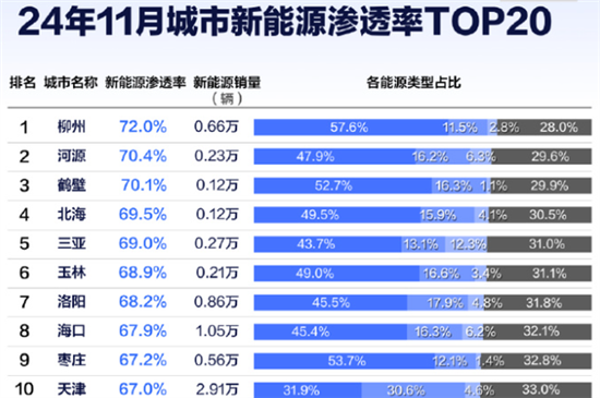 具体来看,11月新能源渗透率前三的城市分别是柳州(72.0%)、河源(70.4%)和鹤壁(70.1%),对应的销量分别是0.66万台、0.23万台和0.12万台。