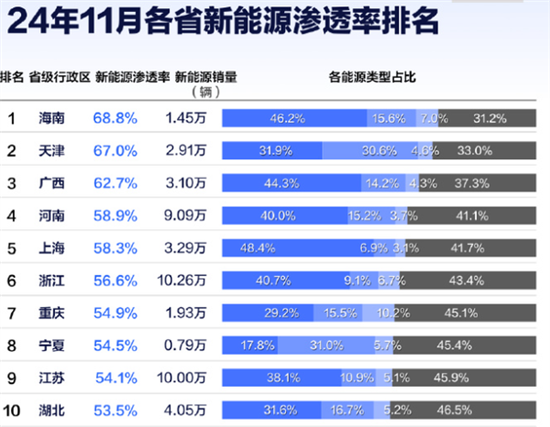 而11月新能源渗透率前三的省份(包括直辖市)分别是海南(68.8%)、天津(67%)和广西(62.7%),对应的销量分别是1.45万台、2.91万台和3.10万台。