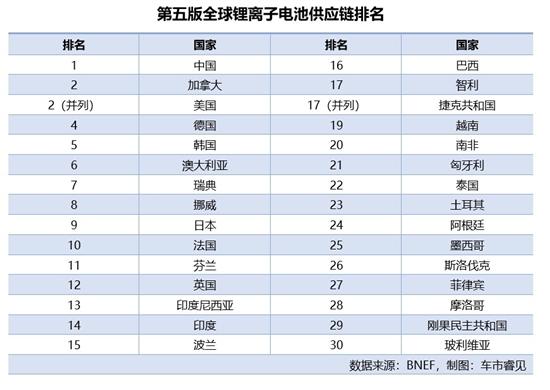 日前,彭博新能源财经发布第五版全球锂离子电池供应链排名。依靠先进的基础设施、低廉的商业电价,以及竞争激烈市场环境中表现的韧性,中国超越加拿大,位居榜单首位。美国和加拿大并列第二,巴西和印度尼西亚获得最大排名增幅,而欧洲整体供应链潜力显示出倒退的迹象。