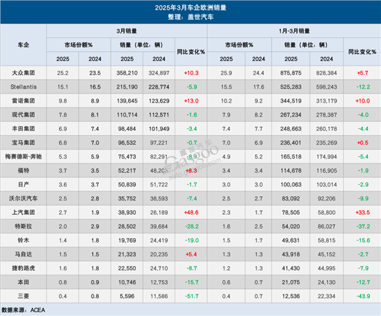 值得一提的是,上汽集团3月在欧洲的销量极为亮眼,同比大涨48.6%至38,930辆,为榜单中同比增幅最大的车企,市场份额也从去年同期的1.9%上升至2.7%。