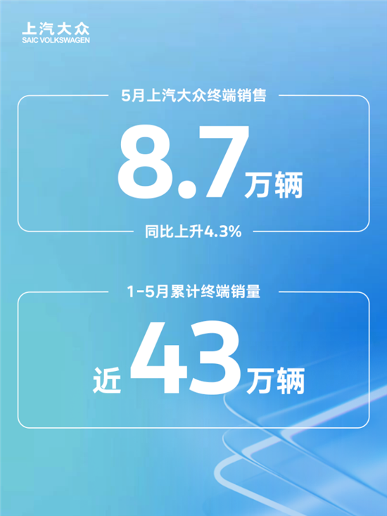 日前,上汽大众公布最新销量数据显示,5月终端销售8.7万辆,同比上升4.3%,1-5月累计终端销量近43万辆。