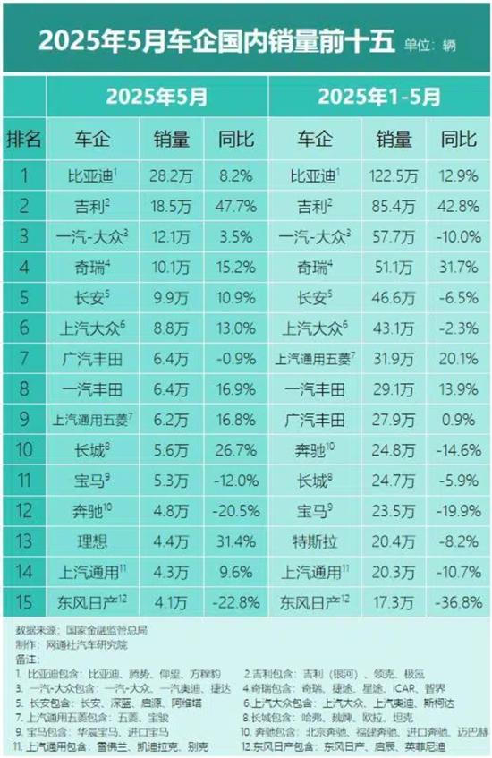根据国家金融监管总局最新数据,5月,在国内乘用车市场,销量排名前15的车企的总销量为135.2万辆,同比增长10.7%,在整体市场的市占率为72.5%。