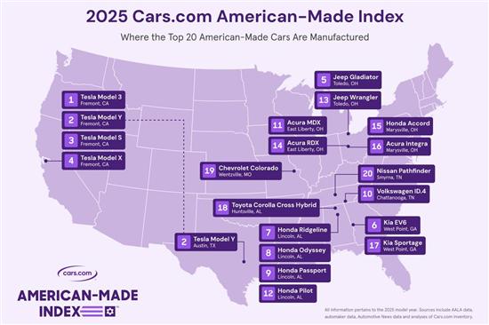 本指数榜评估对象为2025款在美国生产的车型,Cars.com共分析了其库存中的17.3万辆汽车,完成了450次经销商实地核查,并综合参考了联邦监管机构、整车厂和美国汽车新闻的数据。