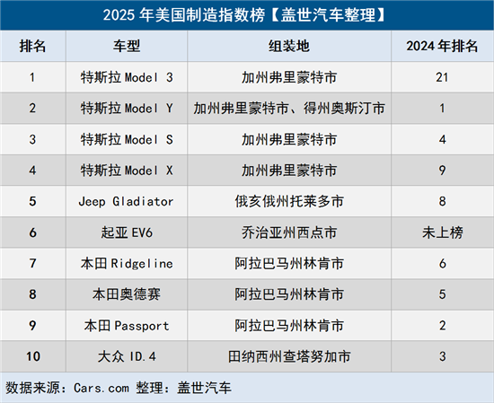 近年来本田汽车稳居榜单前列,2025年亦不例外。自2017年以来,本田在阿拉巴马州生产的Ridgeline皮卡和奥德赛MPV始终位列前十,Passport SUV自2019年入榜后同样表现稳健——本田这些车型凭借长期较高的美国产零部件占比及美国本土组装优势,持续占据榜单头部位置。此外,在俄亥俄州托莱多工厂生产的Jeep Gladiator皮卡,以及在田纳西州查塔努加工厂组装的大众ID.4纯电SUV也再度回归榜单前十阵营。