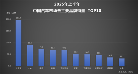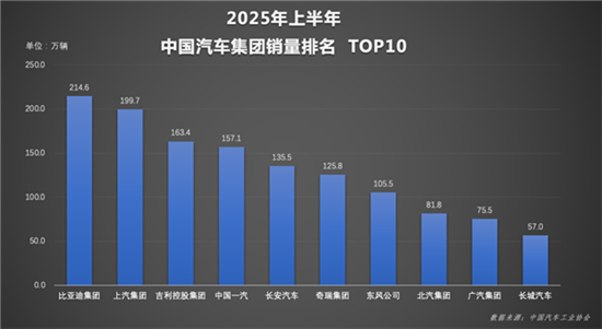 根据中汽协数据显示,比亚迪集团上半年销量达214.6万辆,居中国汽车集团销量前十之首,也是唯一一家上半年销量超200万的车企。