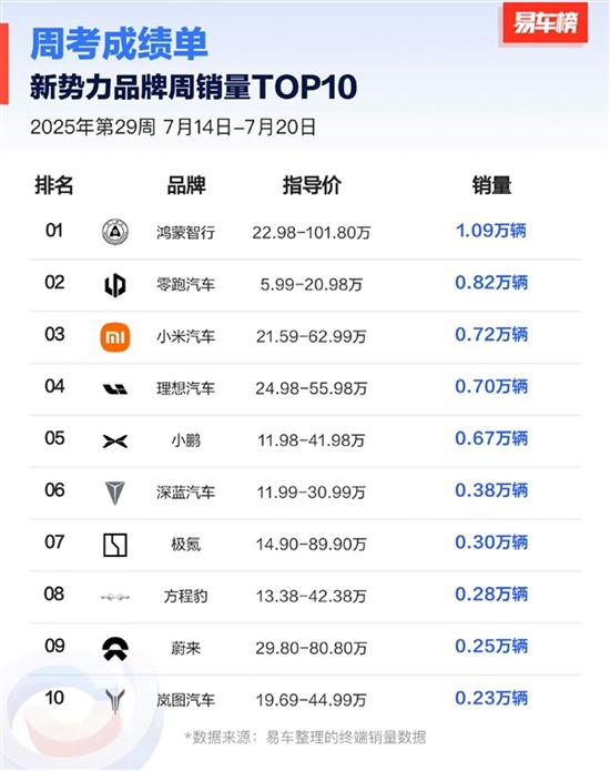 每当周二,就是新势力周交付量更新的时候,易车发布了今年第29周(7月14-20日)的交付量榜单。