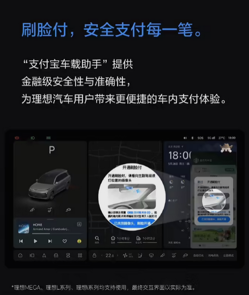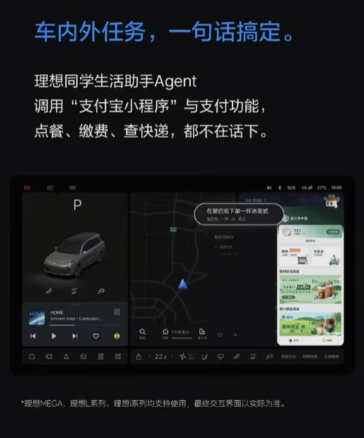 用户在理想汽车上安装该App后,可直接调用支付宝小程序及支付功能,实现点餐、缴费、查询快递等常用操作。