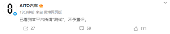 刚刚,鸿蒙智行、AITO问界和智界汽车均发布微博称:已看到某平台所谓“测试”,不予置评。