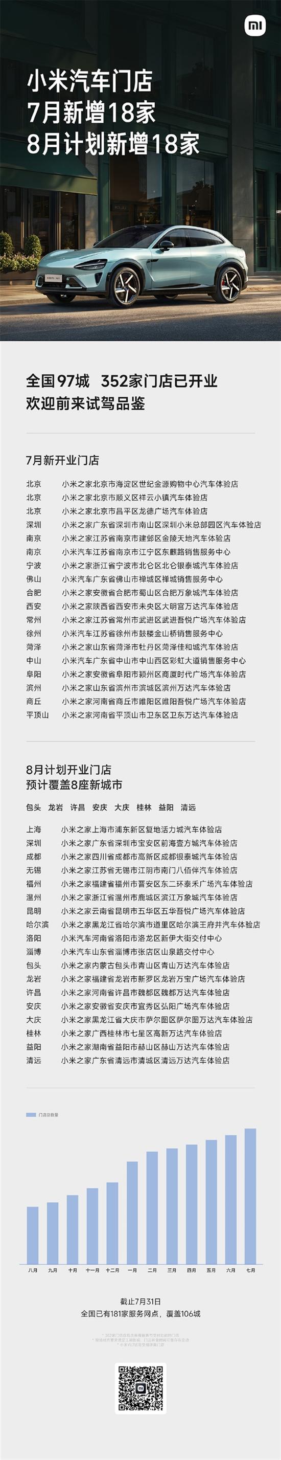 官方表示:7月,小米汽车新增门店18家,全国共有352家门店,覆盖97座城市。