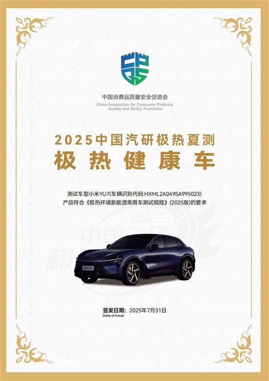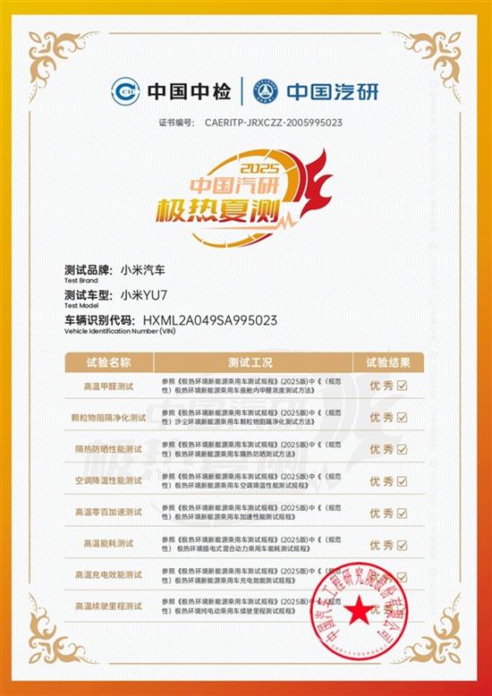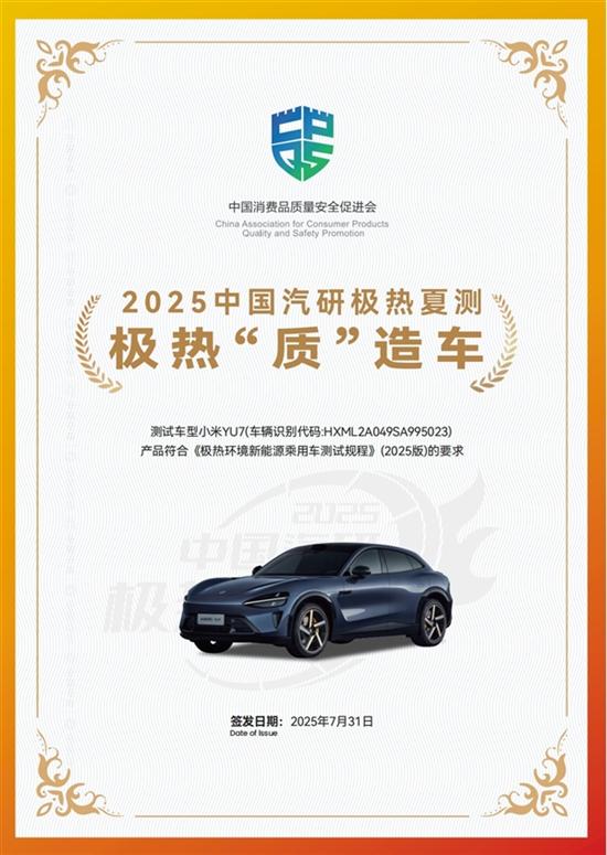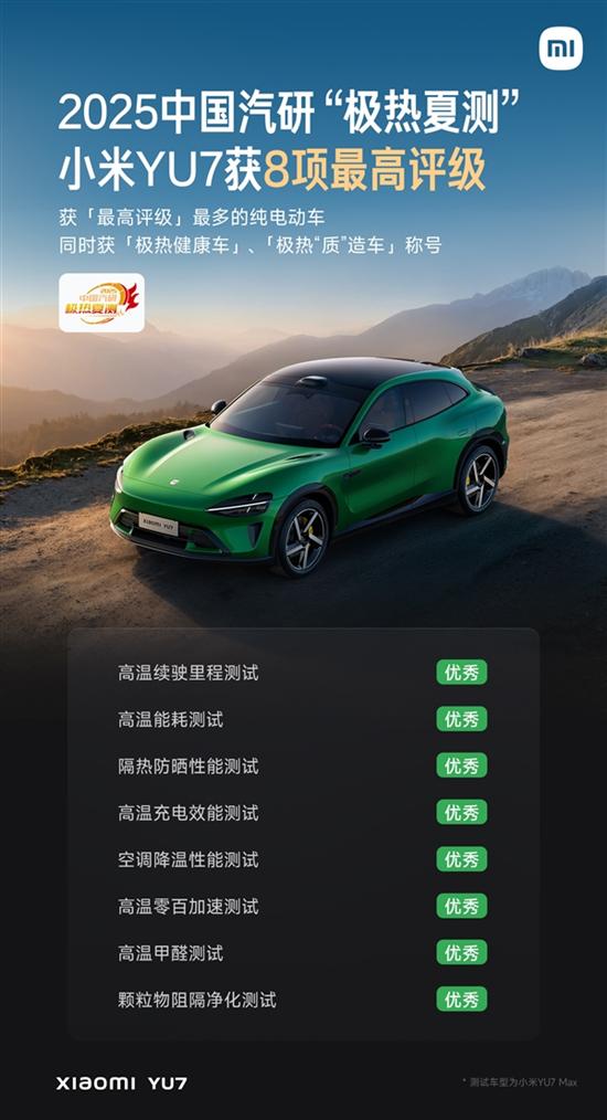 小米汽车公布了2025年中国汽研(中国汽车工程研究院)“极热夏测” 中YU7的成绩,YU7获8项最高评级,同时获极热健康车、极热“质”造车称号。