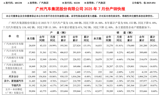 8月8日,广汽集团发布2025年7月产销快报。7月汽车产量12.85万辆,同比下降18.06%;本年累计产量93.02万辆,同比下降8.48%。7月汽车销量11.95万辆,同比下降15.38%;本年累计销量87.48万辆,同比下降12.89%。其中新能源汽车7月产量31485辆,同比下降9.76%;销量33411辆,同比下降1.38%。