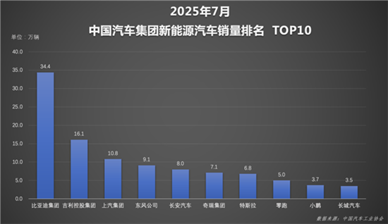在1-7月重点汽车集团新能源汽车销量前十中,比亚迪独占鳌头,销量甚至超过了第二、三、四名销量之和。