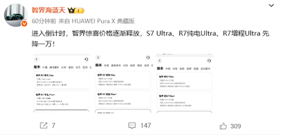 此外,在蔚来ES8发售前,智界汽车产品总监“海蓝天”也公布了一个好消息:智界惊喜价格逐渐释放,S7 Ultra、R7纯电Ultra、R7增程Ultra先降一万!