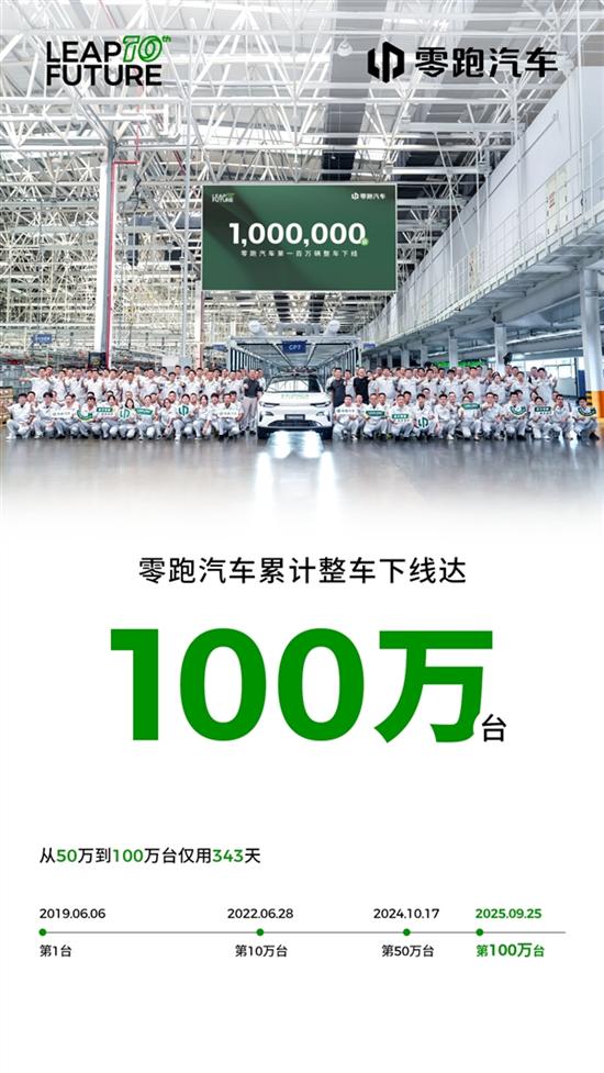 零跑汽车宣布,零跑汽车第100万台整车正式下线,成为国内第二家销量突破100万台的新势力车企。