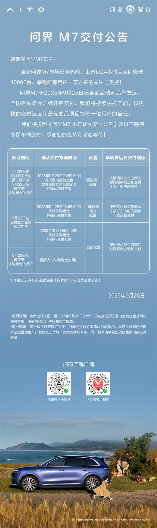 9月23日前支付意向金的预订用户在2025年9月27日00:00后支付认购定金并确认交付方案,以及9月23日后直接支付认购定金的用户,将按照确认交付方案的时间顺序发运和交付。