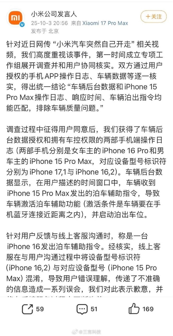 现在,小米汽车官方回应了此事,称双方通过用户授权的手机APP操作日志、车辆数据等逐一核实,得出统一结论“车辆后台数据和iPhone 15 Pro Max操作日志、响应时间、车辆泊出指令均能匹配,排除车辆质量问题。”