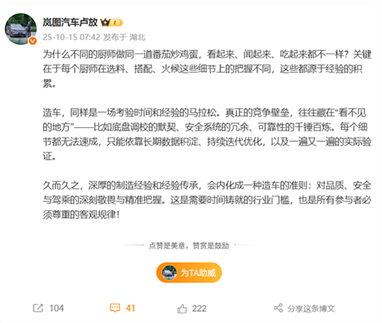 今日,岚图汽车董事长卢放发微博称重申观点:汽车,从来不是快消品。它首先是一种交通工具,关乎用户安全与公共安全,责任重于泰山。