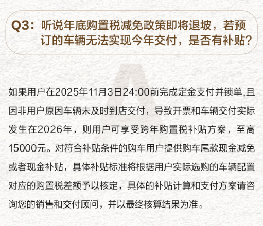 另外,针对近期网友热议的年底新能源汽车购置税减免政策可能退坡的问题,鸿蒙智行官方为用户推出“跨年购置税补贴兜底方案”。