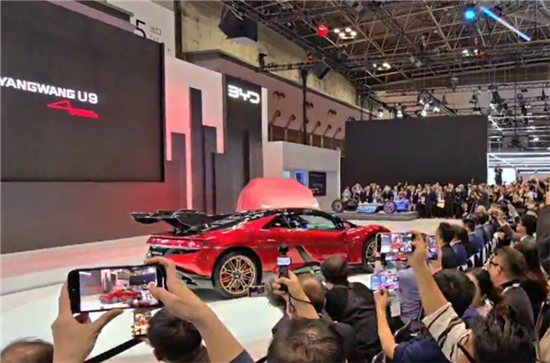 在比亚迪展台的发布会开幕式上,比亚迪首先给日本观众带来了一点震撼,一辆红色的仰望U9超跑,以四轮跳舞的姿态开场,配合现场的音响和灯光,来了一场汽车舞蹈秀。