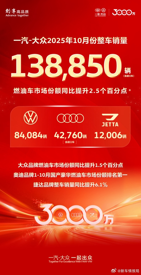 一汽-大众发布最新销量业绩:10月实现整车销售138,850辆(含进口车),燃油车市场份额同比提升2.5个百分点;其中,大众品牌销售84,084辆,燃油车市场份额同比提升1.5个百分点;奥迪品牌销售42,760辆(含进口车),1-10月份稳居国产豪华燃油车市场份额第一;捷达品牌销售12,006辆,同比提升6.1%,为后续战略落地夯实市场基础。