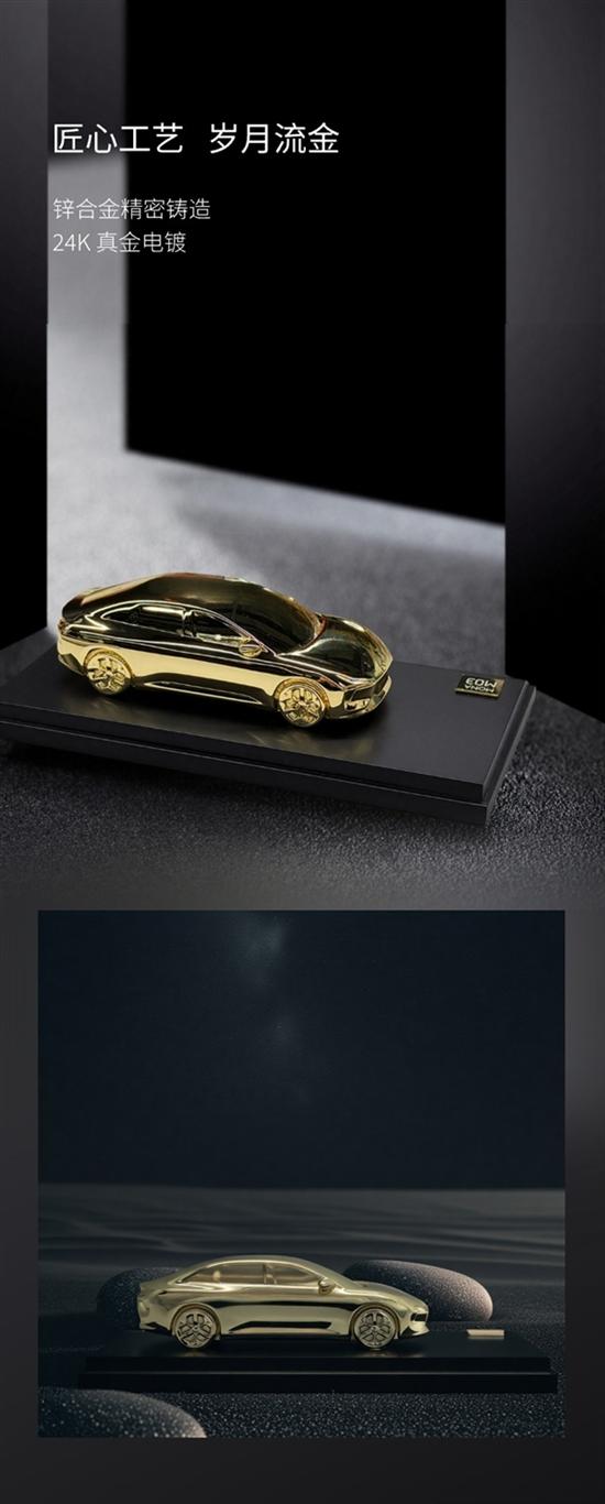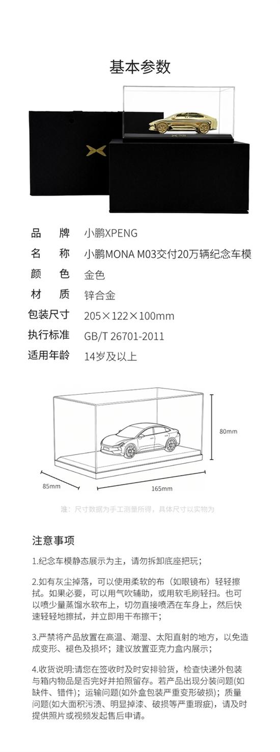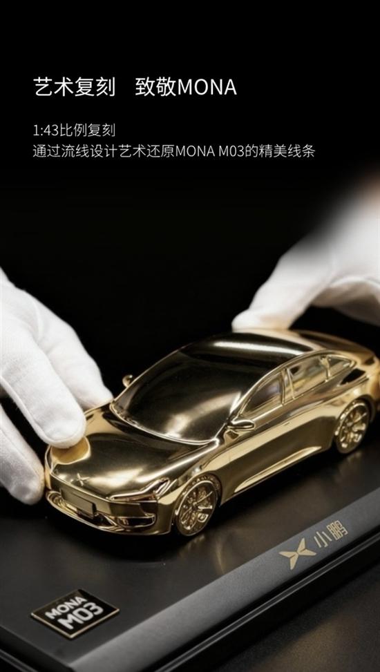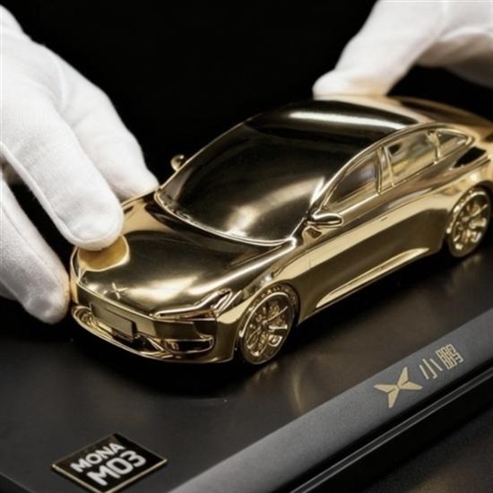 小鹏汽车董事长何小鹏表示,为纪念小鹏MONA交付突破20万台,小鹏商城推出了1:43复刻的小鹏MONA纪念金车模,采用24K真金电镀,限量200台发售。
