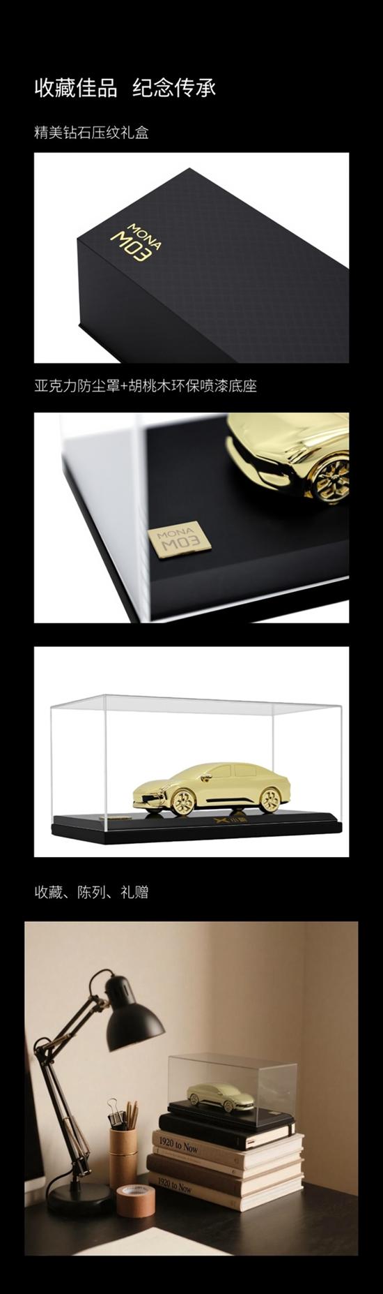 车模为1:43比例复刻,通过流线设计艺术还原MONA MO3的精美线条。车模材质为锌合金精密铸造,并有24K真金电镀。