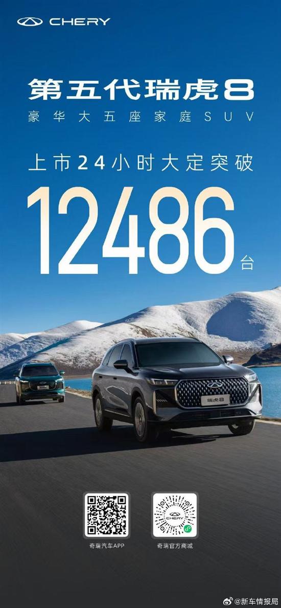 奇瑞汽车称,第五代瑞虎8上市24小时大定突破12486台。