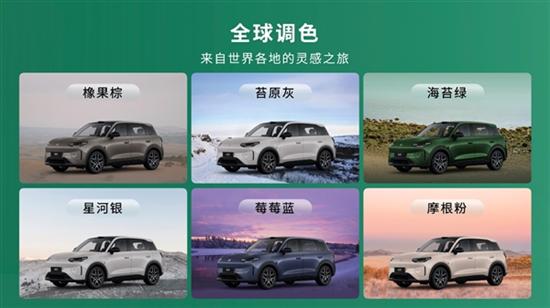 零跑A10共推出橡果棕、海苔绿、莓莓蓝、苔原灰、星河银、摩根粉6款全球自然色,灵感源于全球特色城市及地区。