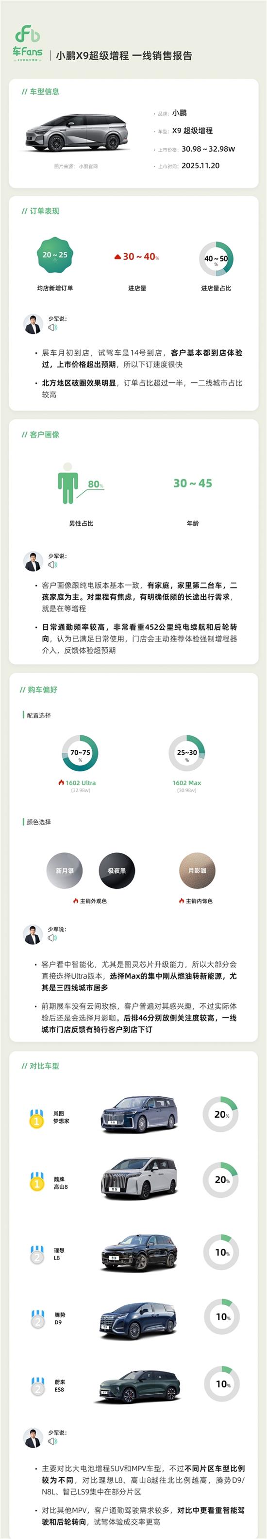 快报显示,X9超级增程展车月初到店,试驾车是14号到店,客户基本都到店体验过,上市价格超预期后下订速度很快,其中在北方地区破圈效果明显,订单占比超过一半,一二线城市占比较高。