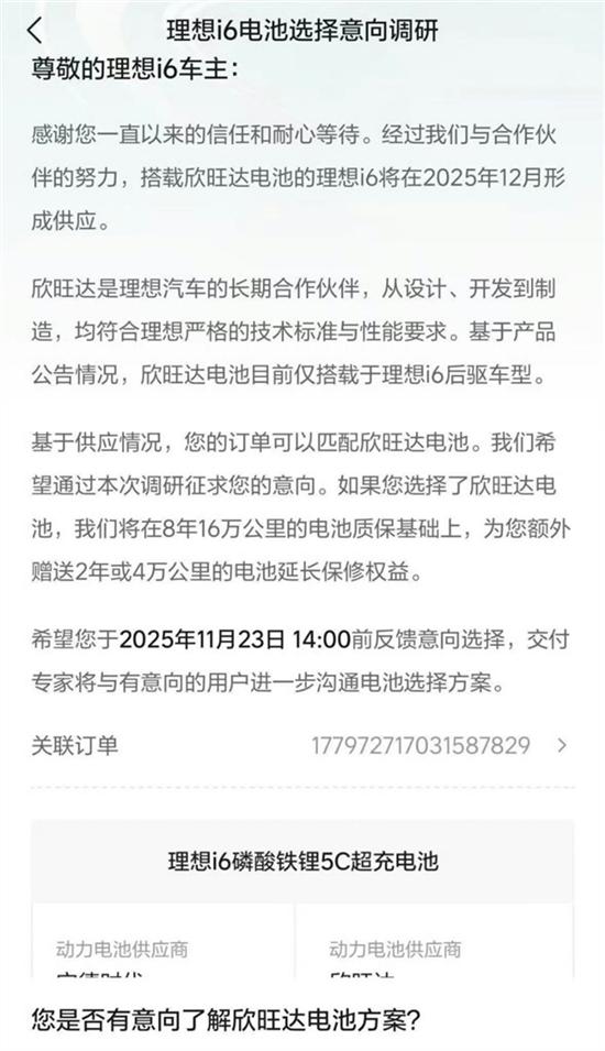 从网上流传出的《理想i6电池选择意向调研》来看,搭载欣旺达电池的i6(仅后驱版)将在12月形成供应,如果用户选择了欣旺达电池,理想将在8年16万公里的电池质保基础上,额外赠送2年或4万公里的电池延长保修权益。
