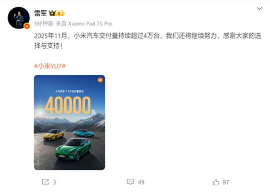 小米集团创始人、董事长兼CEO雷军刚刚发文宣:“2025年11月,小米汽车交付量持续超过4万台,我们还将继续努力,感谢大家的选择与支持!”