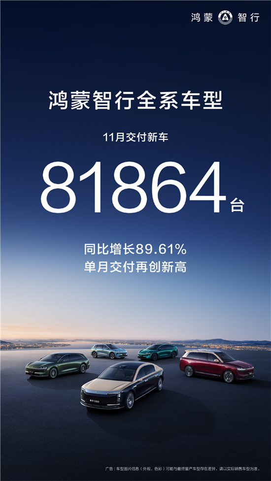 鸿蒙智行公布最新交付数据,11月,全系交付新车81864台,同比增长89.61%,单月交付再创新高。