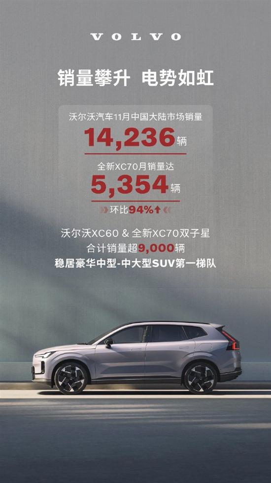 沃尔沃汽车公布2025年11月销量数据,中国大陆市场共计售出14236辆,1-11月累计销量突破133103辆。