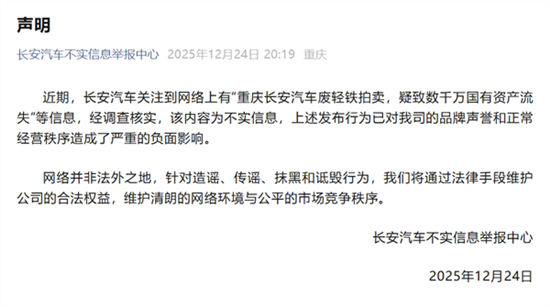 长安汽车不实信息举报中心今日发文称,近期,长安汽车关注到网络上有“重庆长安汽车废轻铁拍卖,疑致数千万国有资产流失”等信息。