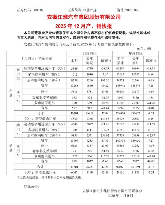 江淮汽车发布2025年12月产销快报。12月生产汽车36204辆,较去年同期的26418辆增长37.04%;2025年全年累计产量378060辆,较去年累计的396827辆下降4.73%。