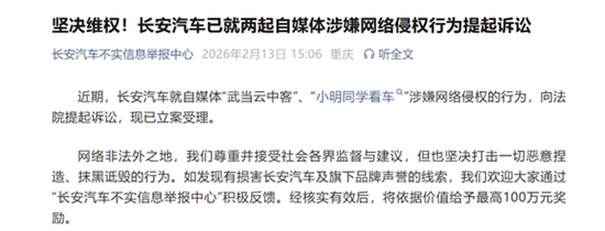 长安汽车不实信息举报中心发布声明,公司就自媒体“武当云中客”、“小明同学看车”涉嫌网络侵权的行为向法院提起诉讼,目前相关案件已被法院立案受理。