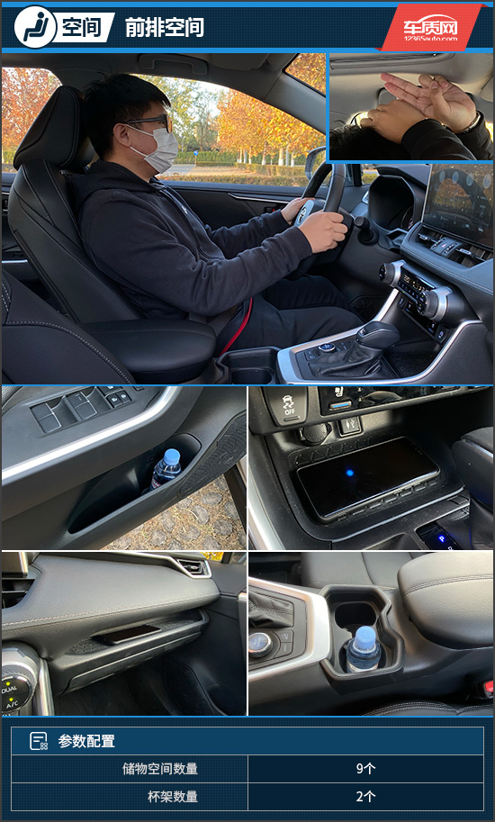 身高175cm的体验者坐进前排,将座椅调整至最低,前后调节至合适的位置后,头部可有一拳两指的空间余量。同时,储物空间的设置充足且巧妙,不仅储物槽数量和容积表现出色,同时像副驾前方还配备了一个宽大的储物槽,能够方便放置随身的物品。此外,所有储物槽内部均配备了橡胶彻底,且杯架内部还配备了限位装置,实用性满分。