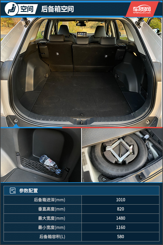 后备箱内部空间极为宽敞且十分规整,可以看到轮拱侵占的现象并不明显,空间利用率不错。常规状态下,后备箱容积为580L,同时后排座椅支持4/6比例放倒,进一步提升了扩展能力。此外,在后备箱内部右侧还能找到一个配备了网兜的储物槽,能够放置一些小件易倒的物品。掀开地台盖板,可以看到玛吉斯品牌的非全尺寸备胎以及多个随车工具,不过并没有设置独立的储物空间。