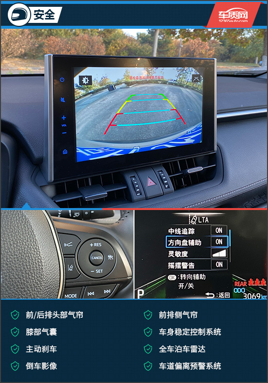 此次试驾的广汽丰田威兰达虽然仅配备了全系最入门的动力系统,但安全功能却丝毫没有懈怠。比如前排侧气囊、前/后排头部气帘、膝部气囊、胎压报警、主动刹车、车道保持系统、车道偏离预警以及全车雷达等,非常丰富。主动刹车可以根据车速以及车头与前车的距离进行数据分析,当系统察觉容易与前车发生碰撞时,会立刻通过蜂鸣提醒,并在行车电脑上通过红色提示框来警示驾驶者注意,如果此时驾驶者仍为做出反应,主动安全系统便会介入,并采取紧急制动刹停车辆,从而确保车内人员的安全。